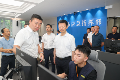 8月14日,廖文彬在市应急指挥部,调研汛应急指挥体系建设和防汛、防地灾监测预警平台运行情况。